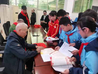 活動伊始,“坐姿端正、文明有禮、認(rèn)真傾聽”——隨著主持老師富有小學(xué)特色的指揮語落地,階梯教室里100余名同學(xué)們迅速抬頭挺胸,目視前方,坐姿筆直?!吧傧汝爢T出列,為來賓佩戴紅領(lǐng)巾”——少先隊員們一一為老領(lǐng)導(dǎo)和嘉賓們系上紅領(lǐng)巾并行少先隊禮。這一開場瞬間將活動儀式感拉滿。