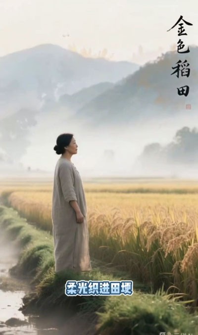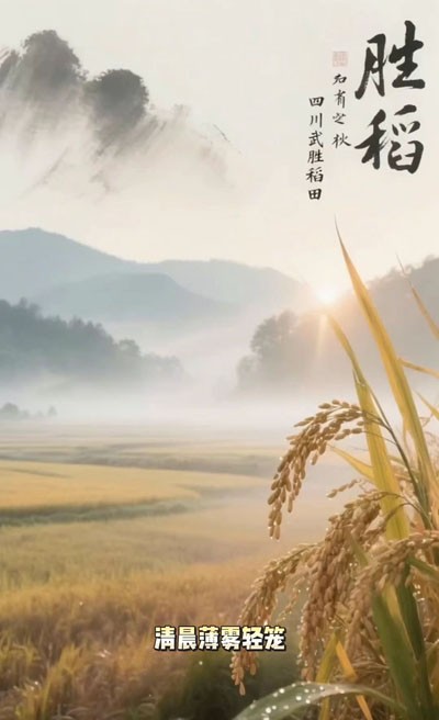清晨,薄霧如輕紗般悄然鋪展,溫柔地掀開四川武勝農(nóng)門那靜謐的面紗。稻田在熹微的晨光中低垂著穗頭,一串串金黃的稻谷仿佛在竊竊私語,訴說著大地深處最細(xì)膩、最溫情的秘密。露珠沿著修長的葉尖緩緩滑落,宛如一句尚未落筆的詩行,晶瑩剔透,含蓄婉約,帶著幾分少女般的羞怯與詩意。這一刻,秋天并非以喧囂的姿態(tài)降臨,而是將陽光細(xì)細(xì)捻成柔光的絲線,一針一線,悄然織進(jìn)軍綠色田埂的褶皺里,也織進(jìn)了女人心底那份對故土綿長而深沉的眷戀。