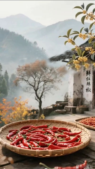 遠(yuǎn)山的剪影斜斜地倚在天際,如同水墨畫中未干的墨痕,濃淡相宜,意境悠遠(yuǎn),仿佛時(shí)間在此刻也學(xué)會(huì)了留白。嘉陵江的支流在不遠(yuǎn)處蜿蜒流淌,水聲輕緩如吟,像極了祖母在夏夜搖著蒲扇時(shí)哼唱的那首古老歌謠,低回婉轉(zhuǎn),沁入心脾,喚醒了記憶深處最柔軟的角落。院角那幾株桂樹,悄然吐露著細(xì)碎而清冽的芬芳,不張揚(yáng),卻足以讓整個(gè)小院都浸染上秋日特有的氣息。風(fēng)兒輕輕一拂,香氣便調(diào)皮地躍入竹匾,與那一堆堆晾曬的紅辣椒撞了個(gè)滿懷——紅的熱烈奔放,香的清幽內(nèi)斂,恰似川中女子外剛內(nèi)柔、剛?cè)岵?jì)的性情,熱烈中藏著溫婉,煙火里透著詩意。