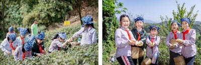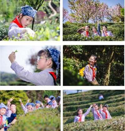 4月9日,“茶圣”陸羽筆下蒲村茶溪谷的萬(wàn)畝茶園層疊如浪。晨霧還在茶山飄蕩,孩子們已系上藍(lán)印花布圍裙,背著竹編茶簍化身“采茶童子”,“食指拇指捏住芽根,輕輕一提!”根據(jù)茶園老師的示范,大家將帶著露珠的一芽一葉收入簍中。茶壟間穿梭的身影與清脆的歡笑驚起山雀,一根根嫩綠的茶青漸漸鋪滿竹簍底部。午后,茶香彌漫的手工制茶坊內(nèi),孩子們看了看滾燙的鐵鍋,模仿制茶師傅的動(dòng)作,將茶葉輕輕拋起,茶葉在鍋里輕盈地跳起了舞蹈……