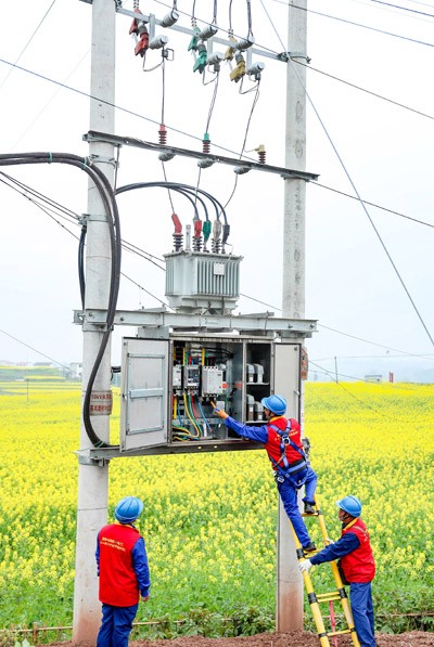 2025年3月12日,國家電網四川省華鎣市供電公司的志愿者在永興鎮(zhèn)大佛山村檢修變壓器,確保春耕生產用電。