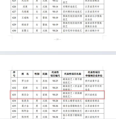 2025年3月17日,文化和旅游部公布了第六批國家級(jí)非物質(zhì)文化遺產(chǎn)代表性傳承人名單,宜賓市珙縣苗族蠟染技藝大師熊宗會(huì)(苗)名列其中。