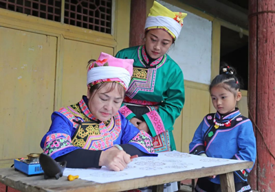 學(xué)會(huì)苗族蠟染技藝的熊宗會(huì)大師,幾十年如一日地學(xué)習(xí)鉆研、辛勤傳承,先后被授予四川省農(nóng)村手工藝大師(2018年12月)、川渝鄉(xiāng)村女能人之“巧手鄉(xiāng)村女工匠”(2021年9月)、四川省非物質(zhì)文化遺產(chǎn)優(yōu)秀傳承人(2019年12月)。其作品《苗族蠟染系列》被評(píng)為“看四川—民間文藝創(chuàng)作工程優(yōu)秀作品”,《掛畫》獲得“中國白酒文化節(jié)民間工藝品展”金獎(jiǎng)。