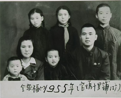 榮鴻琪(時8歲)1955年的‘全家?!昂嫌?,照片下側(cè)為榮泉源回憶歷史之手跡(其90歲 ——2000年寫)。