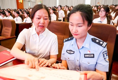 2025年5月13日,在四川省華鎣市開展的“法佑青春,揚(yáng)帆未來”主題宣傳活動(dòng)中,剛被聘為華鎣中學(xué)的兩名法治副校長在交流。