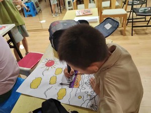 活動開始,九江街道萬家社區(qū)關(guān)工委志愿者老師為孩子們分發(fā)的空白素描紙、鉛筆、橡皮擦、彩筆等繪畫用品。志愿者老師給孩子們講了繪畫的一些基礎(chǔ)知識,要孩子們按照要求,發(fā)揮自己的想象開始了繪畫創(chuàng)作。孩子們經(jīng)過認(rèn)真思考過后,用畫筆勾畫出各式各樣的作品圖案線條,展示著孩子們對于事物的仔細(xì)觀察與理解,在搭配上各自喜歡的顏色,使自己的美術(shù)作品更加形象直觀。每一幅畫都體現(xiàn)了每個孩子對于美追求和理解的展示。盡管有些孩子對于線條的處理并不完善,但是他們畫仍然是那么美。