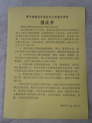 我們相信,垃圾分類這一工作,一定會在廣大老年人中產生較大共鳴和較大影響,我們相信,垃圾分類這個利國利民的工程,一定會在黃甲邁出較大步伐,這個工作將會再上一個新臺階,工作定會百尺竿頭更進一步,工作定會越做越好,我們人類美好幸福的綠色家園,定會天天擁有。(付仕水)