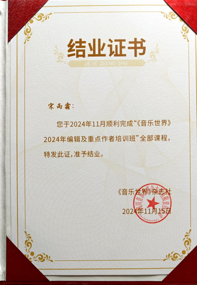2024年11月13日至15日,《音樂世界》2024年編輯及重點(diǎn)作者培訓(xùn)班在成都舉行。成都文理學(xué)院文法學(xué)院寫作課程負(fù)責(zé)人宋雨霜老師作為重點(diǎn)作者受邀參加培訓(xùn)活動(dòng),并獲得結(jié)業(yè)證書。