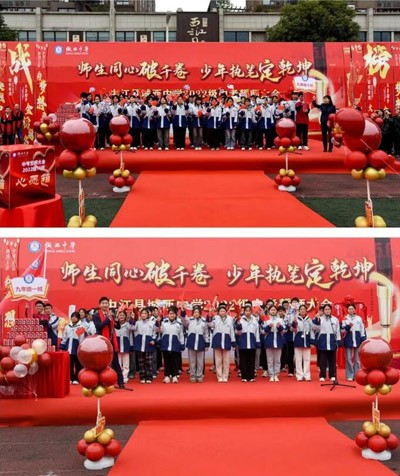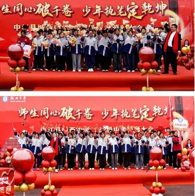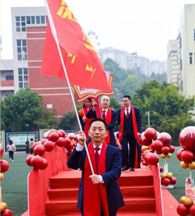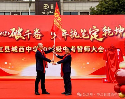 羊崎書記將戰(zhàn)旗交予涂方勇書記的剎那,紅色旗幟翻涌如浪,戰(zhàn)旗所指,是書山題海的征途,更是少年提筆為劍、決勝千里的疆場!