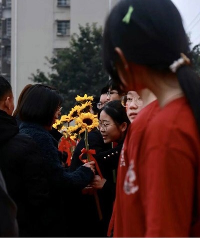 春暉不言,默默守護(hù)。家長手持向日葵花束,走向隊(duì)列中的少年?!霸改阌肋h(yuǎn)追隨光,成為光?!?一句祝福,一支花束,沉默的守望者終于站到聚光燈下, 用最樸素的向日葵,詮釋最長情的告白。