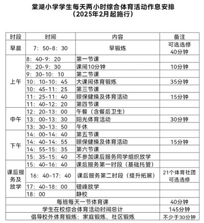 必選必修(體育與健康課、大課間)、可選必修(陽光午休)、可選選修(早鍛煉、課后社團)相結(jié)合,人人參與,人人落實每天不低于2小時綜合體育活動。