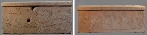 金龍村山形俊美、風(fēng)景秀麗,地理位置特別,西有長(zhǎng)秋山虎踞,東有岷江水蜿蜒,耳聽(tīng)老君廟晨鐘暮鼓,縱觀通濟(jì)堰潤(rùn)澤千年,歷來(lái)被傳為“風(fēng)水寶地”。在金龍村的山崖上高低錯(cuò)落分布了眾多漢代崖墓。在這些崖墓中,往往會(huì)發(fā)現(xiàn)石棺這種葬具,因其棺蓋和棺身有浮雕或線刻畫(huà)像故稱(chēng)畫(huà)像石棺。新津館藏的5具漢畫(huà)像石棺中有2具石棺(編號(hào)1號(hào)石棺和編號(hào)4號(hào)石棺)皆出土于金龍村。1987年,新津文管所在鄧雙鎮(zhèn)龍巖村(現(xiàn)為永商鎮(zhèn)金龍村)石廠灣一座裸露崖墓中發(fā)現(xiàn)一石棺(編號(hào)1號(hào)石棺),雕刻有朱雀、伏羲女?huà)z、車(chē)馬出巡、梁高行、魚(yú)、鳥(niǎo)魚(yú)六幅圖案。2000年,又在鄧雙鎮(zhèn)龍巖村(現(xiàn)為永商鎮(zhèn)金龍村)大云山一座崖墓內(nèi)出土一具畫(huà)像石棺(編號(hào)4號(hào)石棺),棺蓋上刻有連幣(彼此間以綬帶串聯(lián)的16枚方孔圓錢(qián))圖案,石棺上雕刻日月神、天祿辟邪、魯秋胡戲妻、狩獵圖等畫(huà)像。