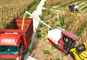 2023年8月6日,四川省華鎣市永興鎮(zhèn)大佛山村的農(nóng)民, 利用收割機搶收“訂單”銷往重慶、成都等地的玉米。