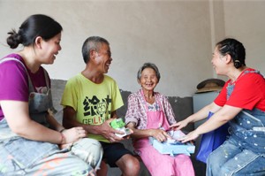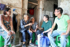 2023年7月12日,四川省廣安市社會保險局的黨員干部冒著酷熱,在華鎣市陽和鎮(zhèn)蔡家灣村看望慰問老黨員梁萬光(左二)。