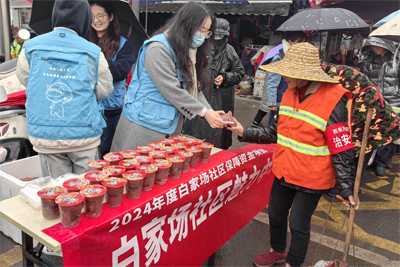 活動(dòng)現(xiàn)場(chǎng),社區(qū)工作人員和志愿者分為5個(gè)小組分別在老市場(chǎng)、新市場(chǎng)、觀音閣街、天賜苑、明苑五個(gè)點(diǎn)位為轄區(qū)居民派放“臘八粥”,“時(shí)逢臘八望云寒,豆粥飄香供早餐”,冬日的天總是陰雨綿綿,社區(qū)工作人員和大學(xué)生志愿者們擺起了長(zhǎng)桌,長(zhǎng)桌上放滿了裝粥的杯子,不一會(huì)兒桌子前都排起了蜿蜒盤旋的長(zhǎng)隊(duì),機(jī)智學(xué)院的大學(xué)生志愿者把一杯杯熱氣騰騰、甜滋滋的臘八粥派放給居民們,一杯杯熱氣騰騰的臘八粥讓這寒冷的冬日也變得溫暖了起來,王婆婆一邊喝著臘八粥,一邊說:“臘八節(jié)喝臘八粥,討個(gè)好兆頭,粥喝下去,身暖,心也暖叻。”