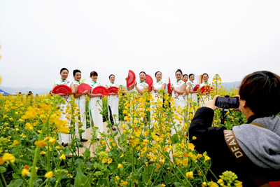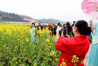 “這里有精彩文藝演出、民俗文化展示,看累了還能逛一逛特色農(nóng)產(chǎn)品展銷,品嘗各種美食小吃。”從廣安城區(qū)自駕來的張志強(qiáng)說,幾天前就已經(jīng)在網(wǎng)上刷到了肖溪油菜花季的相關(guān)消息,“今天恰逢周末,正好帶家人一起來這里出游賞花?!?/p>