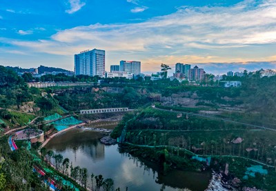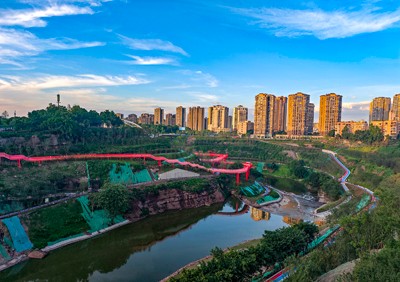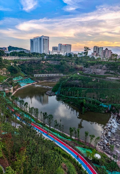 圖為2025年7月2日,四川省廣安市利用城區(qū)荒蕪的西溪峽谷打造的在夕陽映照下的文旅新地標(biāo)西溪峽公園。(邱海鷹/攝影報道)