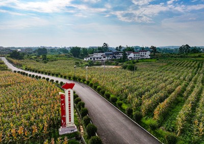2025年7月21日,四川省華鎣市永興鎮(zhèn)馬架坪村連片泛著金黃的玉米和寬闊的鄉(xiāng)村公路及民居,在藍天白云映襯下色彩斑斕,如披錦繡。