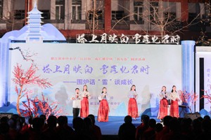這場"盛宴"分別演繹了四個篇章。篇章一,師生們“推窗見雪,飛花凈白”,走進了一場雪的記憶。從《詠雪》《踏莎行·雪似梅花》,到《梅花》《壽陽曲·江天暮雪》等,以一首首詩詞,吟誦盛雪美景。后又以飛花令,對起了含“雪”字的詩句,并齊聲吟誦《沁園春·雪》。