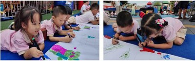 童真視野,絢麗畫筆,畫出獨特的自己,畫出童趣的真在,活動現(xiàn)場,天真活潑的小朋友們歡快地走上舞臺,用手中的畫筆和童真的語言,在兩幅各二十米長的畫布上描繪出了心目中的家鄉(xiāng)都江堰,表達對天府源頭秀美景色的熱愛和對美好未來的向往。參加活動的書畫家還有馬巨良、茍紹龍、姜康明、代祥兵等老師。他們現(xiàn)場創(chuàng)作多幅書畫作品,贈送寧江幼兒園,作為給孩子們的國慶禮物,希望這些作品能夠在孩子們幼小的心靈播下藝術(shù)的種子,激發(fā)他們熱愛祖國大好河山、學習藝術(shù)的熱情。