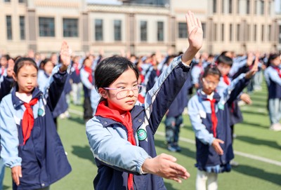 2025年3月27日,四川省華鎣市紅巖小學的學生利用大課間練習交通警察手勢信號廣播體操(簡稱“交通手勢操”),迎接第30個“全國中小學生安全教育日”。