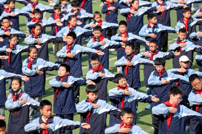 2025年3月27日,四川省華鎣市紅巖小學的學生利用大課間練習“交通手勢操”,迎接第30個“全國中小學生安全教育日”。