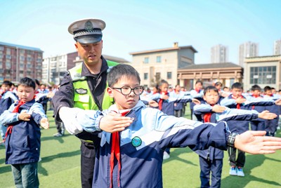 2025年3月27日,四川省華鎣市紅巖小學的學生在交通警察的指導下,利用大課間練習“交通手勢操”,迎接第30個“全國中小學生安全教育日”。