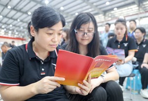 2023年7月21日,四川省華鎣山經(jīng)開區(qū)四川瀚海精密制造有限公司的員工,趁工間休息的機(jī)會翻閱華鎣市青年普法志愿者發(fā)放的法治圖書。