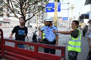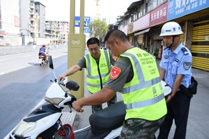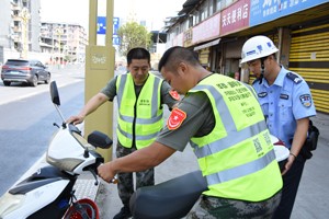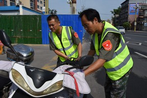 “過來一下‘兵哥哥’(退役軍人志愿服務(wù)隊(duì)隊(duì)員),把這三個(gè)亂放的摩托車抬到規(guī)范的停車位置上去?!痹诮痪闹笓]下,隊(duì)員范長(zhǎng)青等二人協(xié)助交警把三輛摩托車從5米外地方抬到了停車位,汗水不斷從他們的身上冒出來。