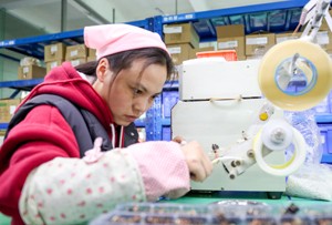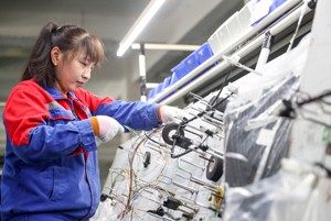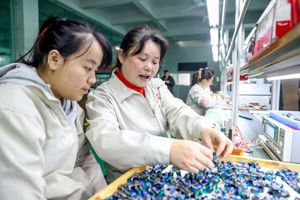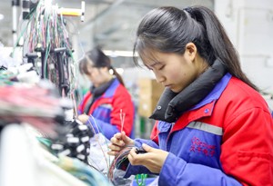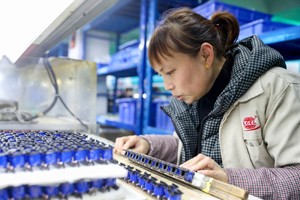 2024年2月19日,四川省華鎣市通過“春風(fēng)行動”留在家鄉(xiāng)的返鄉(xiāng)民工,在華鎣山經(jīng)開區(qū)領(lǐng)創(chuàng)電子有限公司生產(chǎn)流水線上安心作業(yè)。