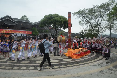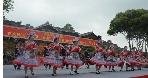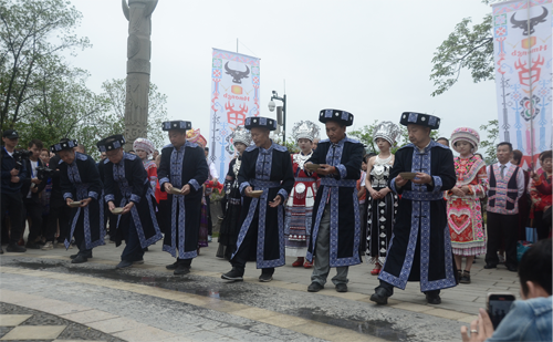 開幕式結(jié)束后,組織開展了從石海涌浪至石海僰寨旅游道上的苗族長號、蘆笙、擺手舞、打蓮槍等表演形式的文化巡游活動。