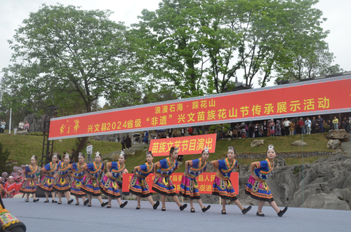 4月22日上午10時,以“浪漫石海·踩花山”為主題的“2024年四川·興文苗族花山節(jié)”正式開幕。在開幕式上,舉行了《四川省鑄牢中華民族共同體意識研究基地興文縣分基地》授牌儀式、縣委書記、縣長周明軍在開幕式上作了熱情洋溢的致辭,宜賓市政協(xié)副主席王賓宣布:“2024年四川·興文苗族花山節(jié)”開幕,隨后開展了《笙動興文》《浪漫石?!贰豆奈柚袊穼嵕肮?jié)目表演。