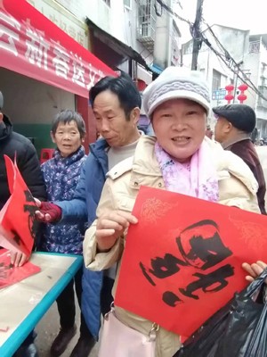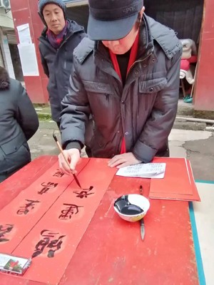 癸卯送福,筆墨迎春。2月6日上午9時(shí)許,薄霧還沒有散去,同仁社區(qū)場鎮(zhèn)上一片興旺繁榮的景象。南充市順慶區(qū)老科協(xié)商務(wù)分會(huì)會(huì)長劉德文組織老專家楊建國、張碧英等同志到分會(huì)聯(lián)系的科技服務(wù)營地-----紅豆家庭種養(yǎng)殖農(nóng)場開展送文化下鄉(xiāng)活動(dòng),區(qū)老科協(xié)常務(wù)副會(huì)長趙志云參加了活動(dòng)。同仁社區(qū)黨支部副書記、紅豆農(nóng)場業(yè)主李燕全程參與并維持秩序。特邀請區(qū)老科協(xié)會(huì)員、市書法協(xié)會(huì)副秘書長、市十大書法名家之一的楊建國同志現(xiàn)場為趕集的鄉(xiāng)親們義務(wù)書寫春聯(lián)100余幅,送福字200余張,受到了大家的熱烈歡迎。商務(wù)分會(huì)通過寫春聯(lián)和送福字等方式,為同仁社區(qū)群眾送上了一份文化“年貨”,帶來了春節(jié)前的氣氛和新春的祝福。