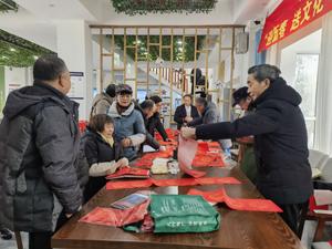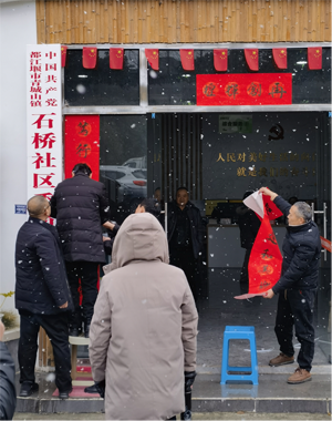 路祥林、高志林、唐啟茂、蔣永勤、趙志偉老師現(xiàn)場書寫春聯(lián)100多幅,“?!弊?0多張。社區(qū)群眾興高采烈,將老科協(xié)書法老師團(tuán)團(tuán)圍住,爭先恐后,踴躍收藏。劉剛會(huì)長為石橋社區(qū)撰寫的對(duì)聯(lián)“踔厲奮發(fā)建和美鄉(xiāng)村,篤行不怠譜石橋新篇”,由唐啟茂書寫后,張貼在石橋村活動(dòng)中心大門口。在歡聲笑語中,暢談對(duì)新春期待,對(duì)龍年的展望。